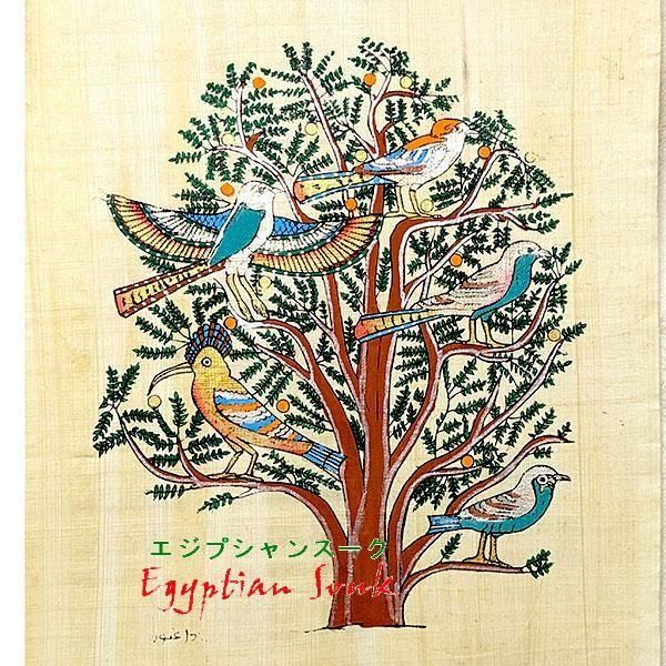 アカシアの生命の木に留まる鳥たちはエジプト独自の死生観を元にした人間の一生を表しています。