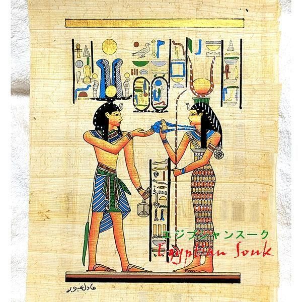 パピルス絵画 ラムセス2世大王と イシス ハトホル(オレンジ)【A4・宅急便のみ】OPで額付